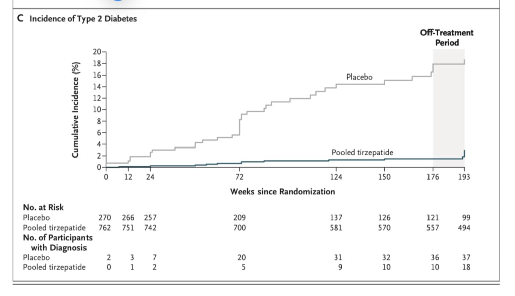 หลัง จากหยุดใช้ 4 เดือนมาดู % การเป็นเบาหวานใน ผู้ใช้ Terzipatide พบ 2.4% vs 13.7% ยาหลอก ต่างกันอย่างมีนัยสำคัญ